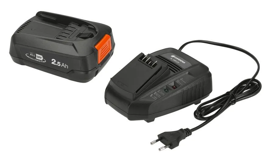 Le kit de démarrage P4A PBA 18V/72+AL 1830 CV 14906-20 Gardena comprend une batterie 18V 2.5Ah et un chargeur compatible. Grâce à la diode LED installée sur le chargeur, l’opérateur a une indication constante de l’état de charge de la batterie, ce qui permet de déterminer avec précision à quelle heure il sera possible de commencer à travailler. Il faut une heure pour charger complètement la batterie, tandis que la LED s’allume en position « ready to go » après 40 minutes soit lorsque la batterie est chargée à 80%. Cet ensemble peut être utilisé pour alimenter tous les appareils sans fil Gardena ayant une tension est de 18V.